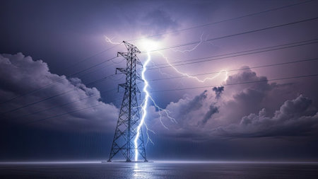 A striking nighttime image captures a powerful lightning strike illuminating power lines. The scene presents dark blue and gray hues, with dramatic streaks of bright light. The composition features an overhead view with a focus on natural elements. This image is suitable for use in educational materials or commercial design projects.