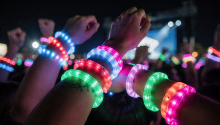 A young handsome man radiates confidence in a stylish illuminated outfit at an energetic gathering.