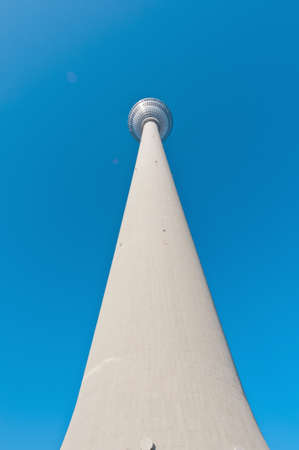 Low angle up view of broadcasting tower Fernsehturm TV Tower at Alexanderplatz. Berlin, Germany