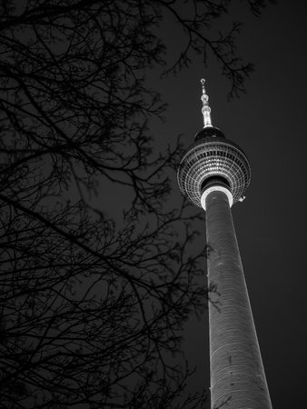 Striking Black and White View of Iconic Berlin TV Tower Against Night Sky with Bare Winter Branches