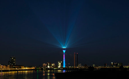 D?sseldorf, Germany - 20 June 2020: A light show with spotlights from D?sseldorf's Rheinturm tower illuminates the night sky over the city.