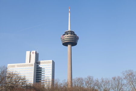 Cologne, Germany - March 8th, 2014 Telecommunication tower Colonius with annex building and trees This tower provides tv signals to Cologne and region