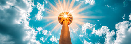 Sun Rays Through Clouds Behind Tall Tower, Modern Contemporary Cityscape Perspective,