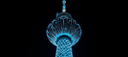 Vibrant Communication Tower with Futuristic Lighting Design against a Black Background