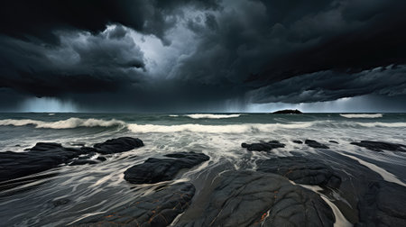 An image captures a coastal scene dominated by a vast, imposing display of dark storm clouds. Heavy rainfall descends towards the ocean surface, creating a stark contrast against the calm water. The composition highlights the raw power of nature, suitable for commercial or editorial applications.