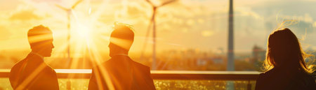 Three business people talking in front of a large window with a view of the city at sunset.