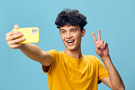 Young man taking a selfie with a bright yellow phone, smiling and making a peace sign against a vibrant blue background, showcasing joy and positivity in modern communication