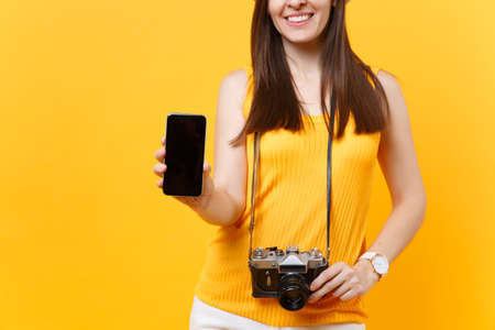 Cropped tourist woman holding mobile smart phone with blank black empty screen isolated on yellow orange background. Female traveling abroad to travel on weekends getaway. Air flight journey concept