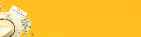 Summer travel flat lay banner, vacation concept with calendar of 2021, straw hat with tropical flowers and money top view with copy space