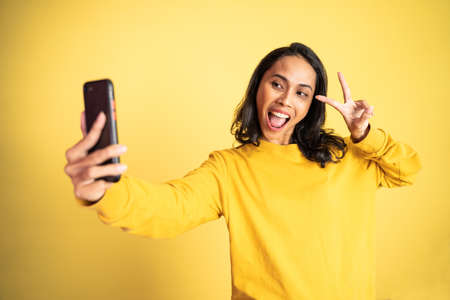 attractive woman take a selfie using mobile phone camera with v sign finger gesture on isolated background