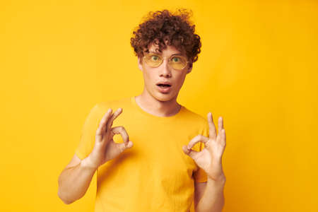 cute red-haired guy wearing stylish glasses yellow t-shirt posing Lifestyle unaltered