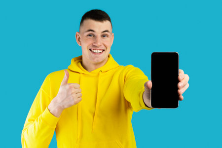 Young Man in Yellow Hoodie Smiles and Shows Smartphone Against Bright Blue Background