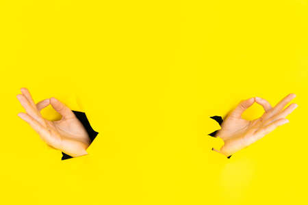 Woman hands in meditation position, waiting for special moment, making wish in torn holes isolated over yellow background in studio. Copy space for advertisement. Practicing yoga, relaxing concept.