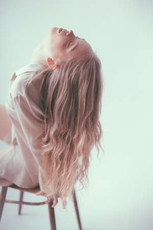 A young woman shaking her blond curly hair isolated on a beige wall background. Art. Rear view of a young blond woman in a white shirt posing and touching her hair.