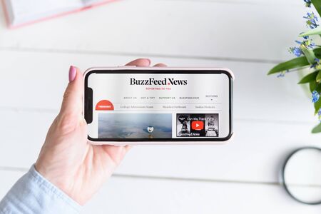 KHARKIV, UKRAINE - April 10, 2019: Apple iPhone X in female hand with BuzzFeedNews.com site on the screen.