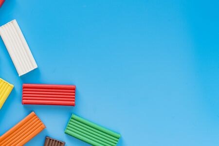 many multi-colored plasticine sticks lie on a white background. for children's creativity. copy space