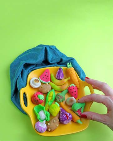 Pieces of polymer clay and handmade fruits and vegetables from it on the white background