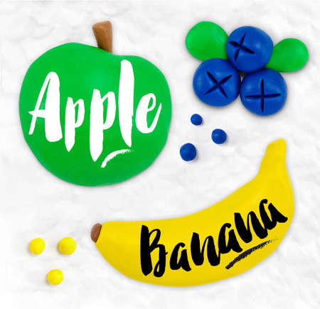 Plasticine modeling fruits apple banana blueberries cobbled together on a white plasticine background