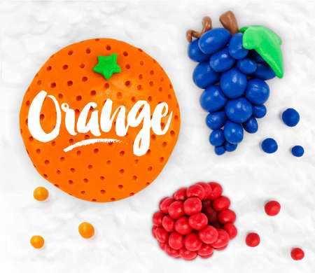 Plasticine modeling fruits orange grapes raspberries cobbled together on a white plasticine background