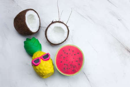 top view funny pineapple toy in sunglasses,watermelon and coconut on a marble table