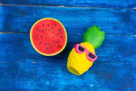 top view funny pineapple toy in sunglasses and squishy toy watermelon on a blue wooden background