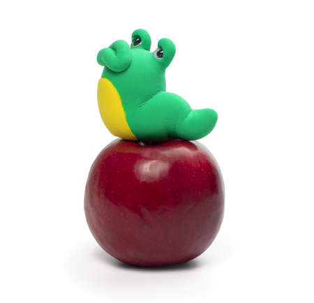 Plasticine worm on the apple isolated on the white background