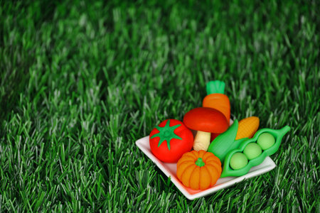 Miniature model of colorful vegetables arrangement on a white plate