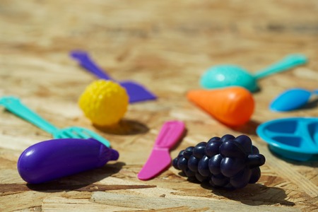 Children's educational toys in the form of food on a blue background. Child development concept, kitchen for children. Artificial food, proper nutrition. Flat lay, top view.