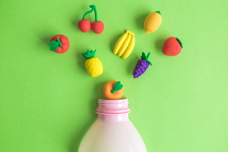 Flying or falling fruits model toys and bottle of smoothie on green background minimal creative concept.
