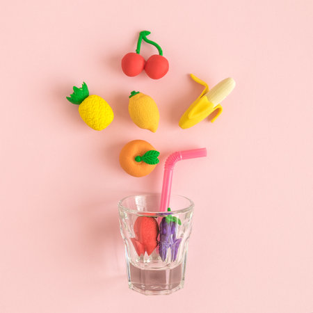 Flying fruits and glass with drinking straw abstract on rose.
