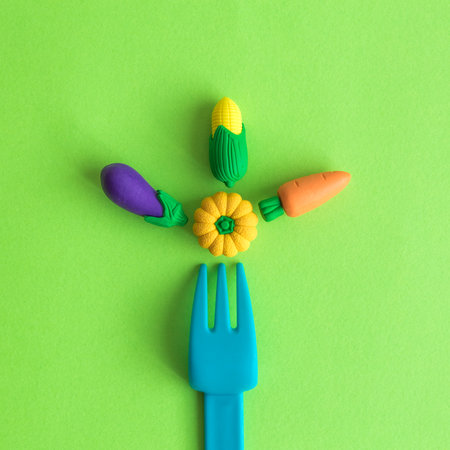 Flat lay of plastic fork and small vegetable toys against green background minimal creative vegetarian concept.
