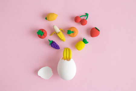 Fruits coming out from broken egg minimal creative easter and spring concept.
