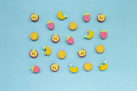 Colorful design fruit shape rubber on blue texture background, cute eraser design background
