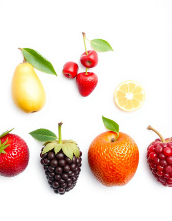 Fruits and berries isolated on white background. Healthy food concept.
