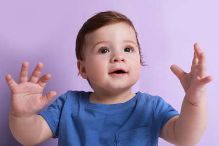 Cute little baby boy on violet background