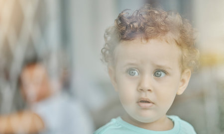 Baby, eyes and safety at window curious with wonder on face in home, toddler and looking in distance alone. Child or boy thinking with thoughtful expression, for danger and left unattended in house