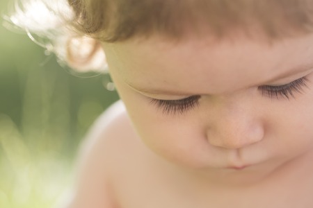 Cute baby looks up at the sky with innocent eyes