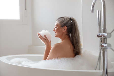 The relaxed woman touches the skin in lather with lather. Woman taking a bath at home