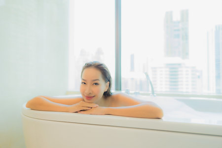 Portrait beautiful young asian woman relax enjoy in bathtub interior