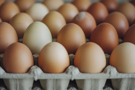 Close-up of different shades of chicken eggs in a paper carton, symbolizing diversity and natural produce