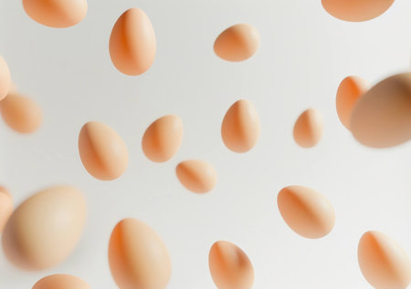 Falling raw eggs in mid-air against a soft light background, creating a dynamic and fresh atmosphere. Food concept and culinary inspiration.