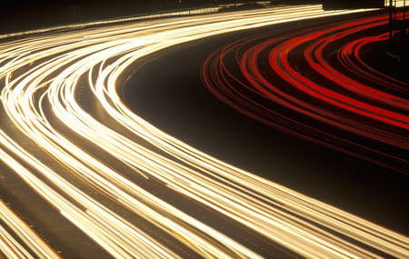 Bright light trails capture the essence of motion on a curved road during nighttime hours.