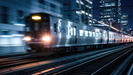 An evening shot of a high-speed train illuminated by city lights as it departs from a bustling station, showcasing the vibrant energy of urban travel