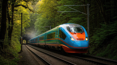 A high-speed train is rushing along the tracks. Generative AI