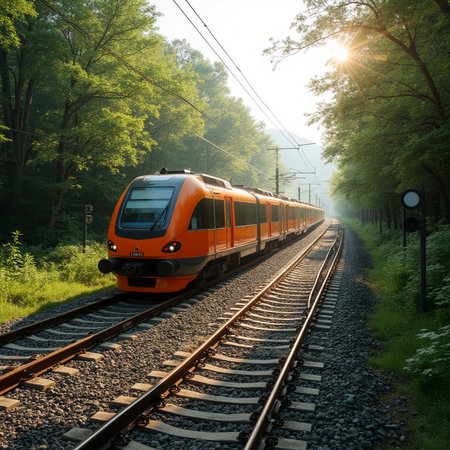A sleek modern passenger train travels along scenic railway tracks, surrounded by lush landscapes and vibrant skies, symbolizing efficiency and connectivity in travel.