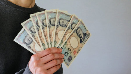 Woman hand holding Japanese Yen banknote stack. Thousand Yen money. Japan cash, Tax, Recession Economy, Inflation, Investment, finance and shopping payment concepts