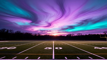 An expansive sports field showcases colorful yard lines stretching toward the horizon. The scene is set under a dramatic blue sky adorned with wispy clouds.