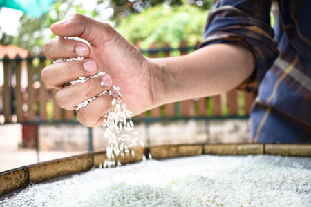 Close up Thai women holding jasmine rice in their hands. Health food products.