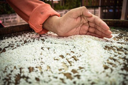 Thai jasmine rice. The hands of an Asian woman are picking up foreign matter from the uncooked milled rice in a red plastic tray before cooking. Raw dry jasmine rice. Uncooked milled white rice.