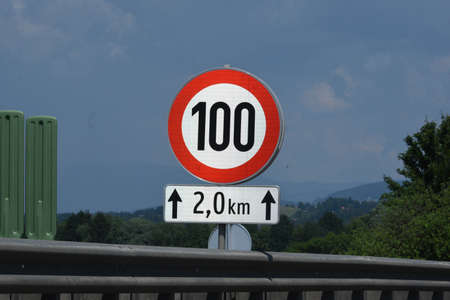 PUCON, CHILE - SEPTEMBER, 23, 2018: Close up of wooden informative sign of 20 km hrs inside of the Pucon recreative place in Chile